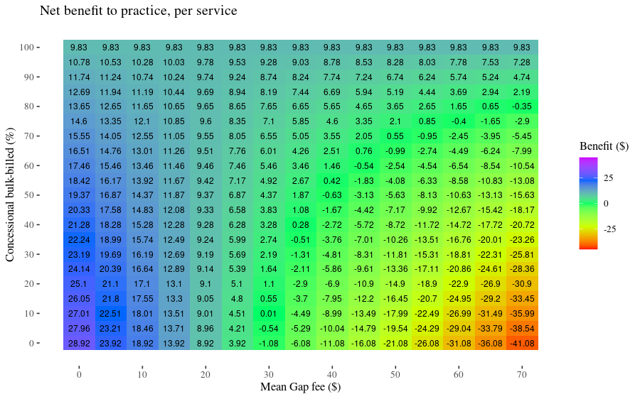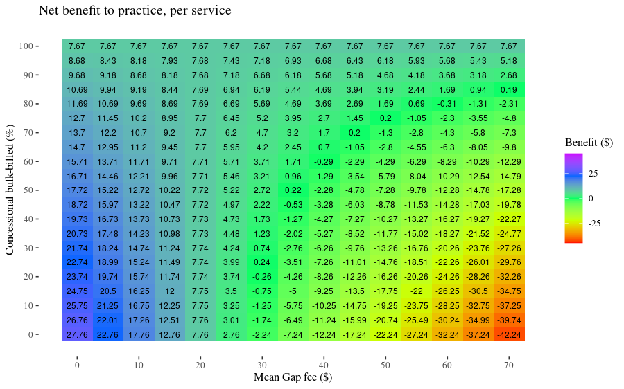 If you ‘Run Code’ the block below With the default settings of 50% of patients are concessionally bulk-billed and a mean gap fee of 50, the benefit-per-patient is shown as -7.84, i.e. a loss of $7.84 compared to the current mean fee of 87.76.