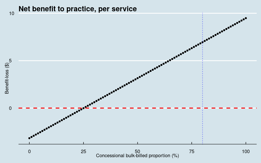 The light-blue vertical dotted line represents the net-benefit (6.55 per service) if 80% of the practice population was concessionally bulk-billed.